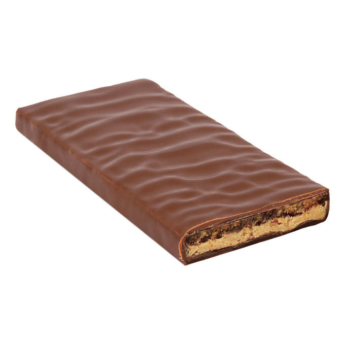 A delicate fruit layer made with bits of apple candied with honey and caramel. In addition, there’s a cinnamon layer with hazelnut praline and white chocolate, and the whole thing is coated in a tender-melting milk chocolate with 50% cacao power.