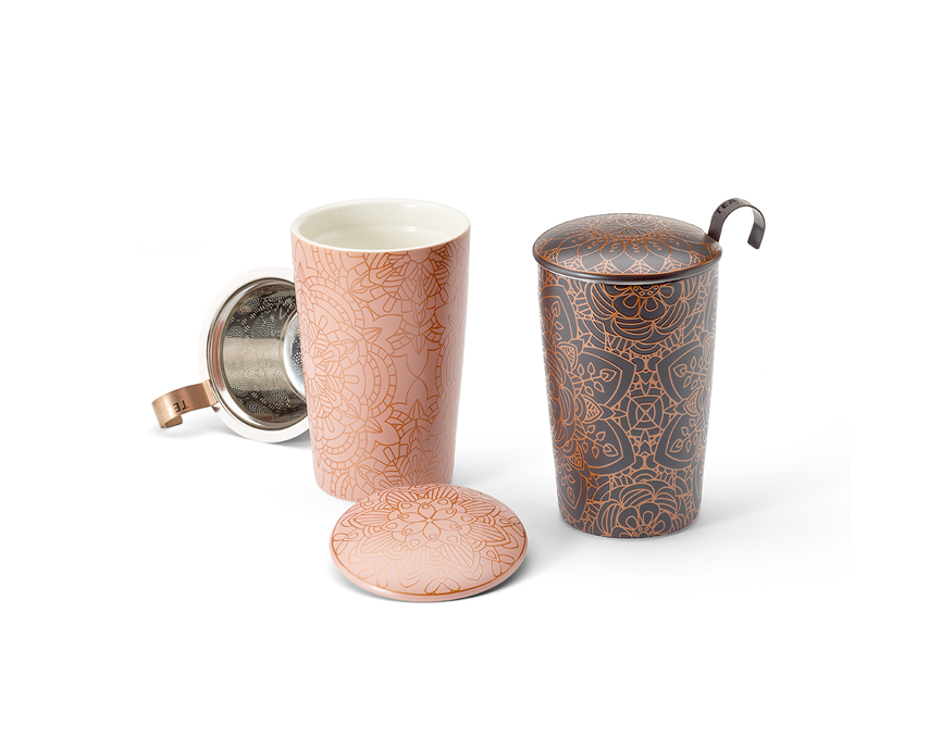 In Hinduism and Buddhism, the mandala is a geometric drawing attributed to a magical or religious meaning. Since a few years mandalas have also become a cult in Western culture as colouring pictures for meditation. This beautiful design picks up on this trend and enchants with a detailed and filigree mandala decor. A 3D optic of the design is created by the raised effect surface finish. This gives the motif depth and creates a pleasant haptic. Beauty for the eyes and great tea enjoyment in one cup. The connection of user-friendliness and design makes this Mandala mug something special.