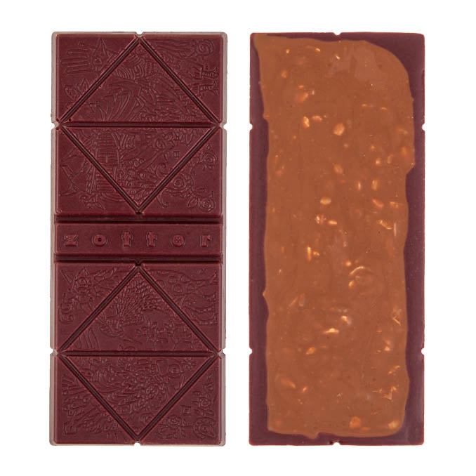 Dark Milk Chocolate° filled with black and red currant ganache°(14%) and macadamia Praline°(36%)