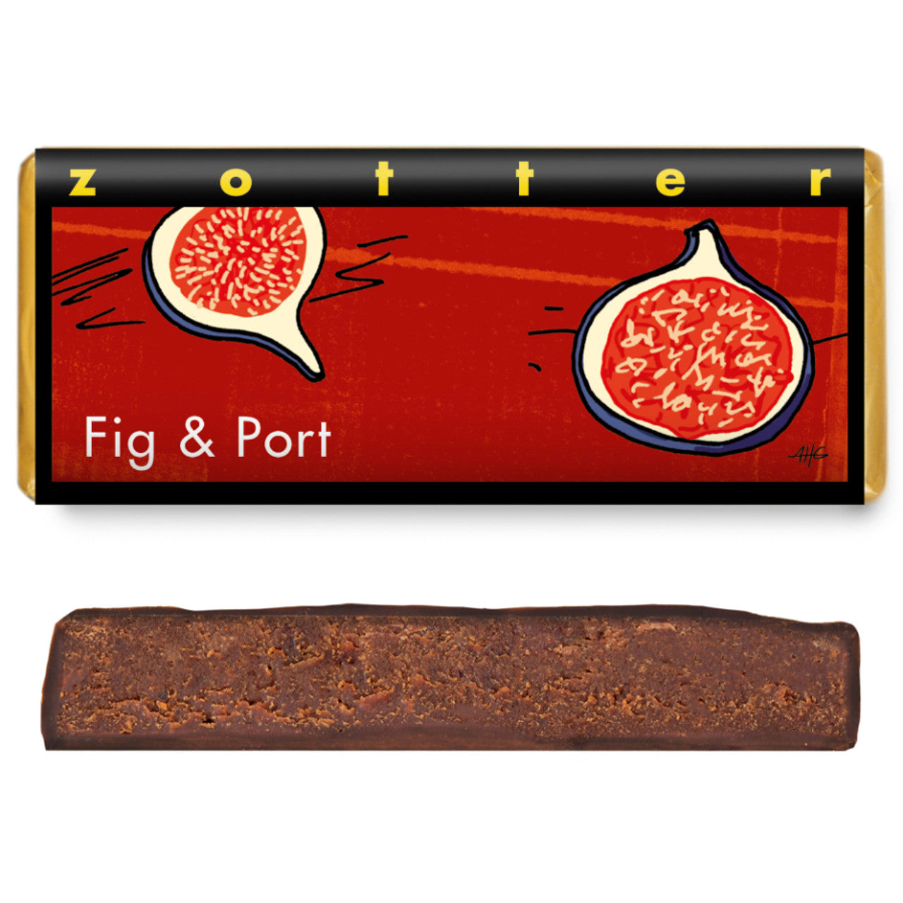 A timeless classic with a sugar substitute: figs in port are a classic dessert or cocktail and now they come as a dessert chocolate by Zotter as well. We use a Portuguese Reserve Ruby Port by Romariz with an extremely fruity flavour, matured in oak barrels, let it flow into a very creamy, dark port ganache and add some bits of fig marinated in port, which pop up as a fruity and excitingly crunchy surprise. It’s covered in dark chocolate with a 70% cacao content, which is sweetened with maple sugar, an exciting sugar alternative.