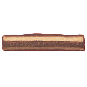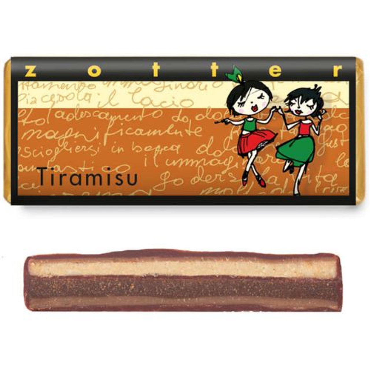 Più bella cosa non c'è : a layer of mascarpone enhanced with almond praline, white chocolate and genuine Bourbon vanilla, with a second, intense coffee chocolate layer made from dark chocolate, a coffee couverture, freshly ground Zotter coffee from their in-house roastery and a generous dash of rum, coated top and bottom with a wafer-thin coffee couverture and covered all over in a fine milk chocolate coat with a 50% cocoa content.