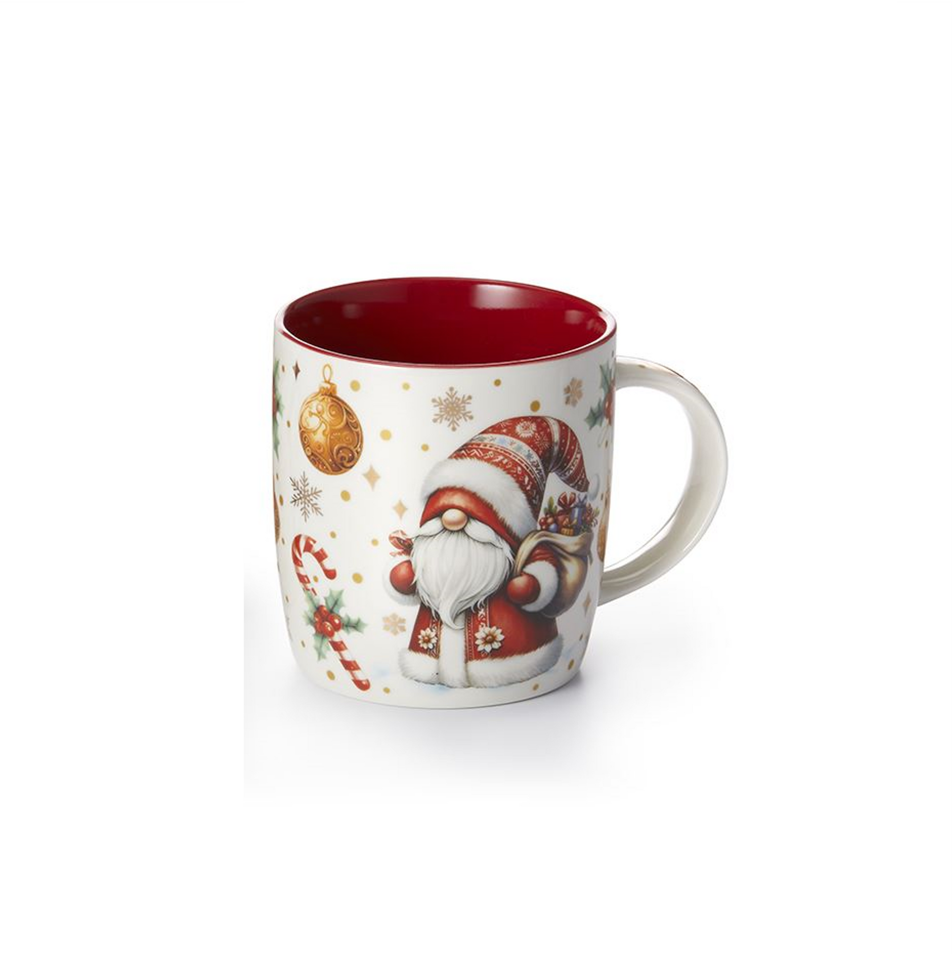 When the delicious smell of cinnamon and pine fills the air, the two kind-hearted elves Puck and Elfin set off through the winter night. Wearing their warm coats and red Christmas hats, they carry big gift bags on their backs, searching for hearts, big and small, to bring joy to. This lovingly designed mug tells their story in a wonderfully detailed decor that combines snowflakes, sparkling stars, candy canes, and Christmas decorations. The elegant gold application gives the item a particularly festive look, while the deep red interior color reflects the warmth of the Christmas season. With its compact and beautifully shaped silhouette, the mug provides the perfect stage for the lavish design. With a medium filling capacity of 0.3 l, it is the perfect choice for enjoying delicious Christmas teas, punch, or mulled wine.