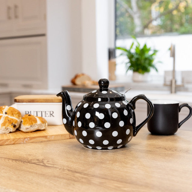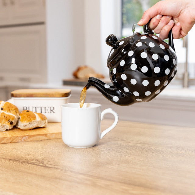 Serve soothing cups of tea the traditional way with this pretty little, polka dot teapot. A shining example of how form and function can come together harmoniously to create something beautiful, this infuser teapot is ready to enhance your teatimes. Designed in the UK, this teapot has tea-serving down to a fine art. Lift it by its comfortable handle and enjoy a seamless pour from its elongated drip-proof spout. Brew any tea you fancy to its flavourful best. This lovely Black and white stoneware teapot is suitable for tea bags, floral infusions and loose leaf teas alike due to its removable fine mesh filter.